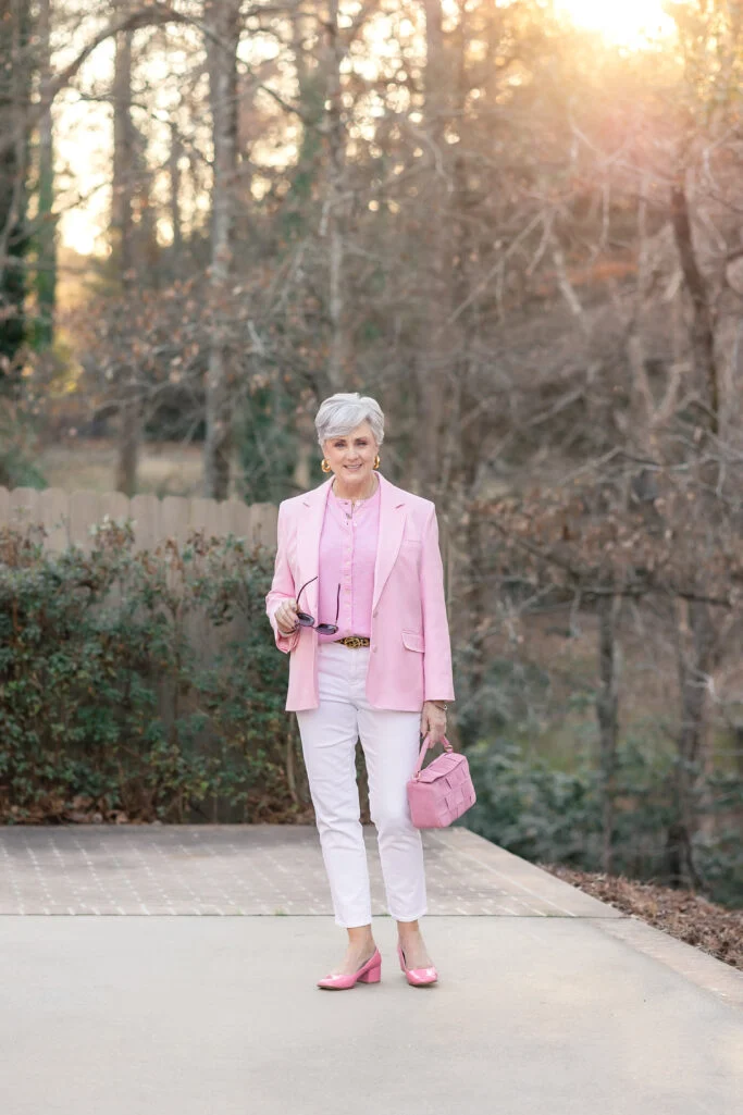 And then the bold move: this J.McLaughlin cardigan blazer in the prettiest shade of pink. It’s the only piece raising its hand — and that’s exactly why it works.