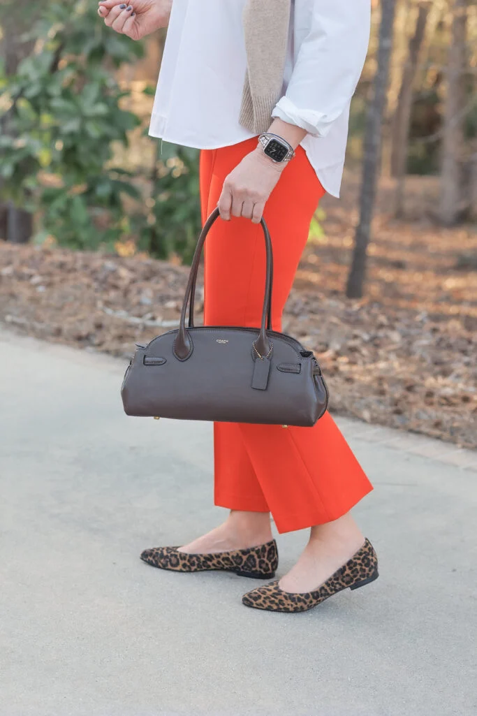 Everything else is whispering — white, cream, camel — so the pants can do their thing. Your eye goes straight to the color. And the Margaux leopard flats? They’re a neutral here. I’ve been saying it for ten years and I’m not stopping now: leopard is a neutral.