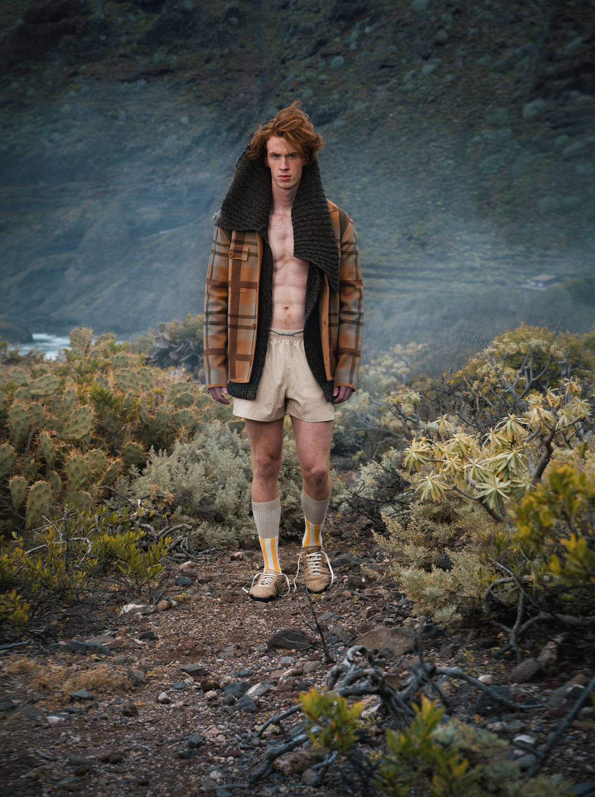 Overshirt by RAW WOOL COMPANY, a brand committed to low-impact production and traceable sourcing. Wool Cardigan by ADOLFO DOMÍNGUEZ. Silk Boxer Shorts by TOM FORD, focused on quality and durability. Socks by DOUBLE A, a brand committed to responsible production through material-conscious essentials. Sneakers by BIKKEMBERGS, focused on durable design and an extended product lifecycle.