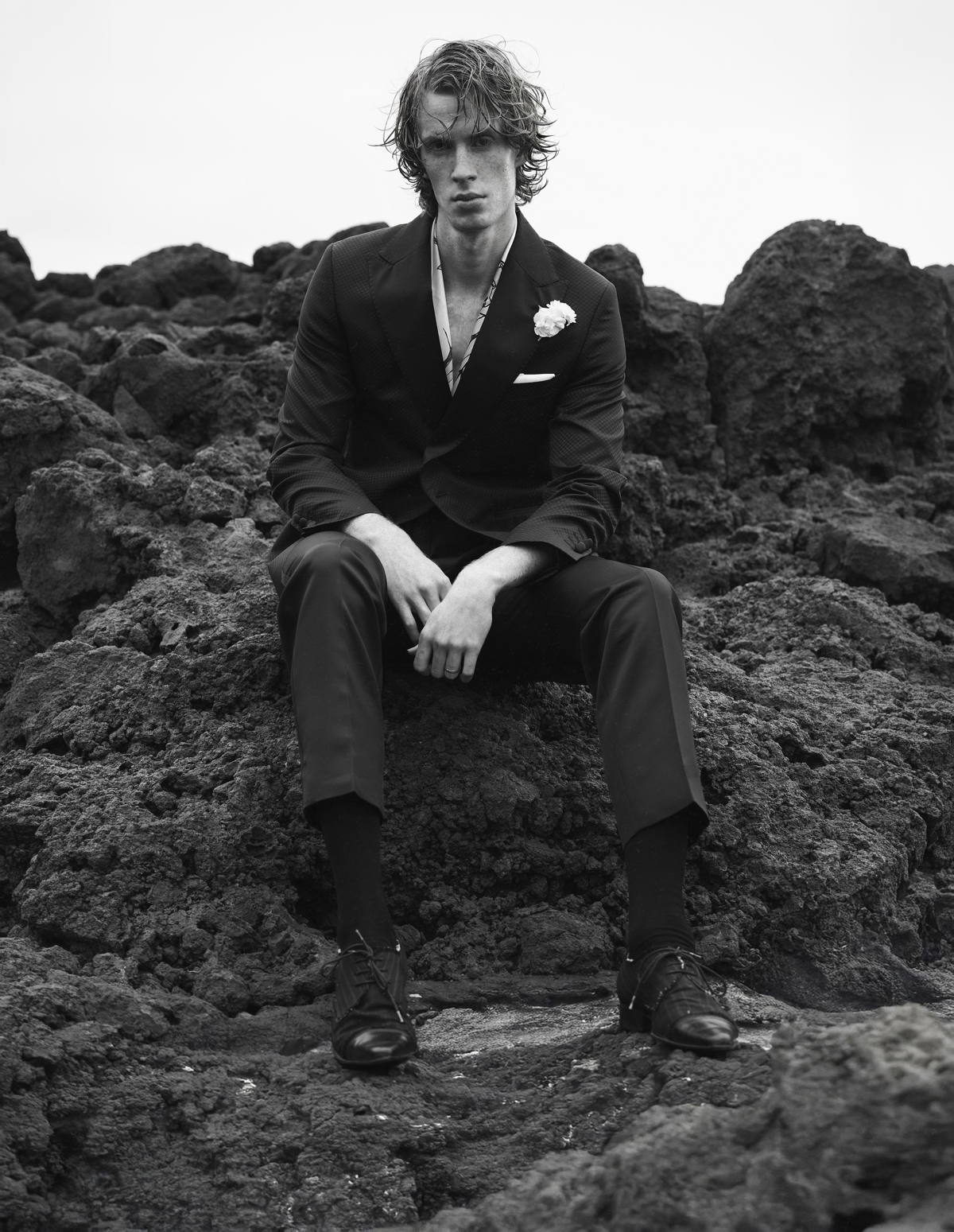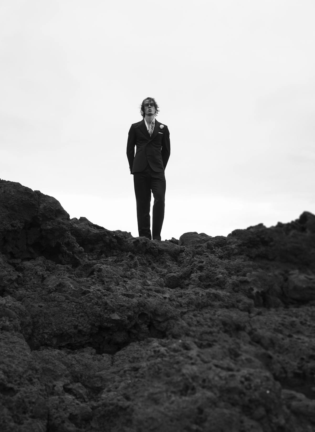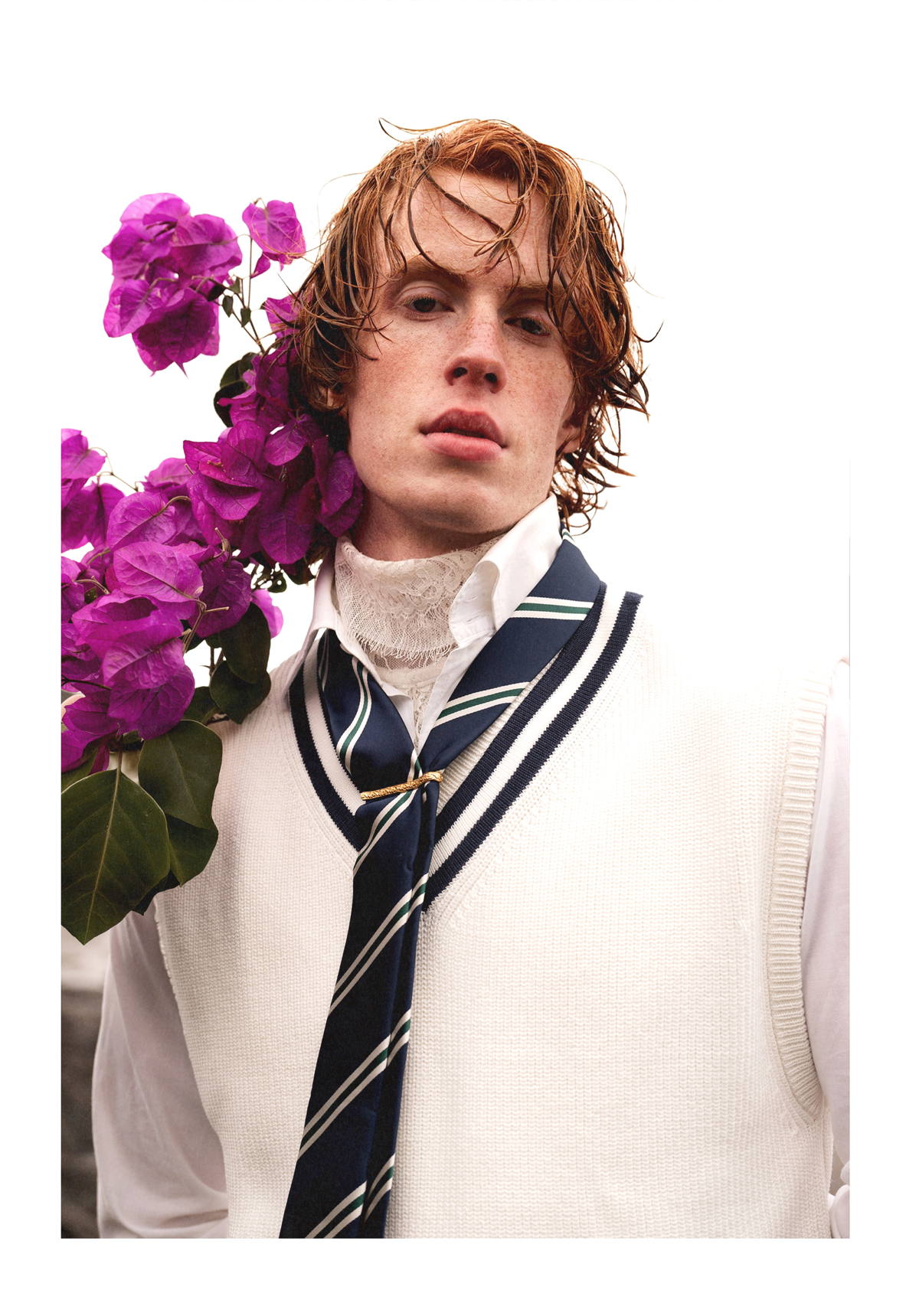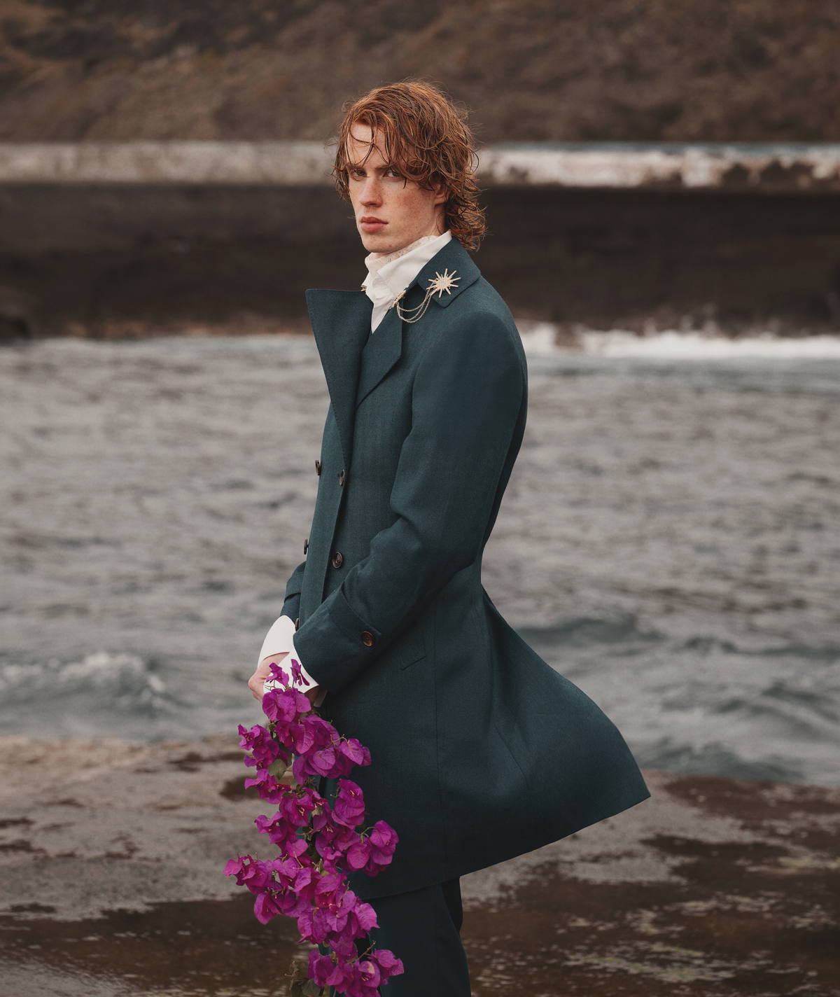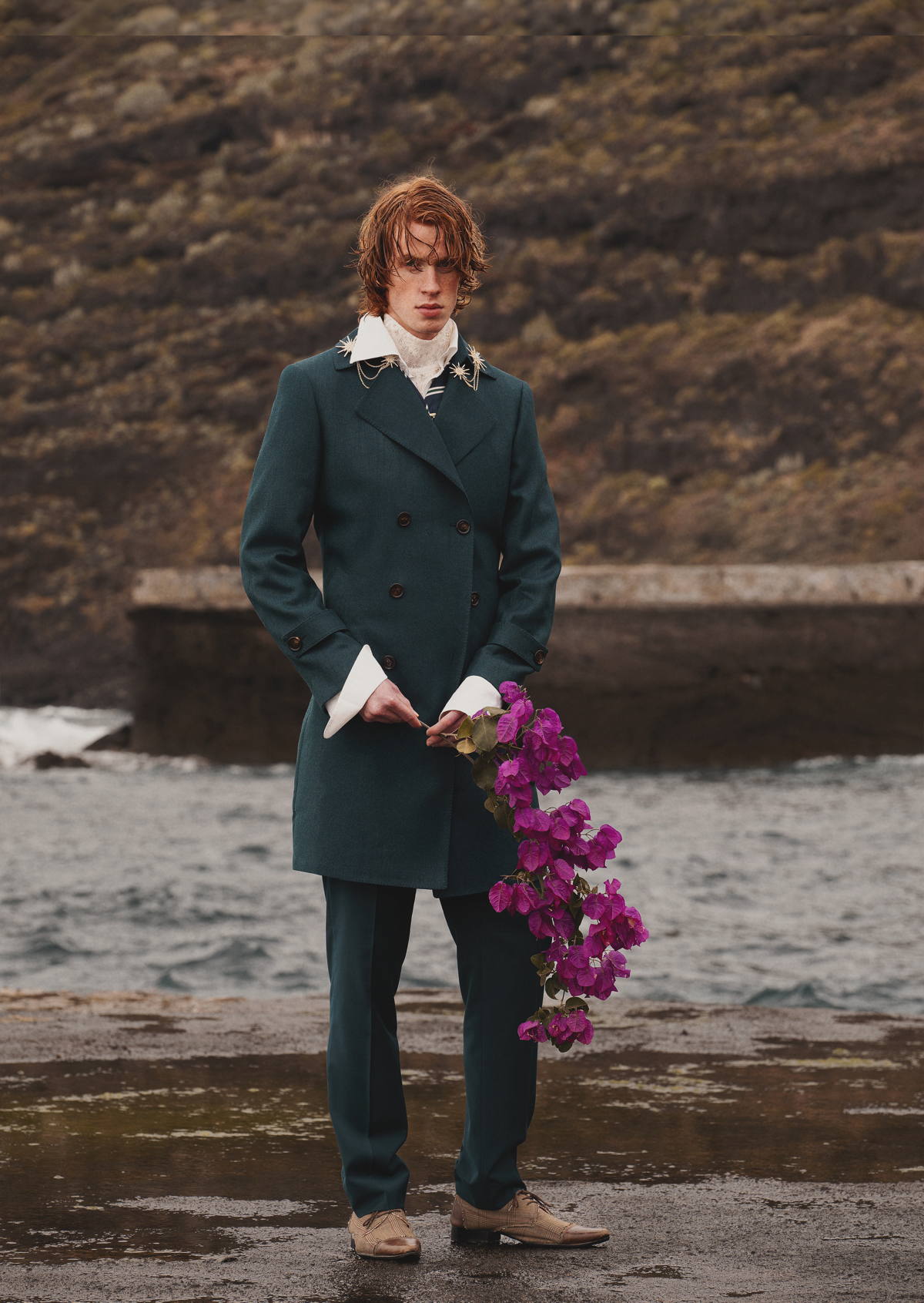 Trench Coat and Trousers by JOSÉ ACOSTA, developed through slow tailoring and local production. Vintage brooches , embracing circularity through reuse. Lace Shirt by FILST, crafted through an artisanal and small-scale production approach. Cotton Shirt and Tie by GUCCI, part of a strategy focused on traceability and circular innovation. Shoes by PAUL SMITH.