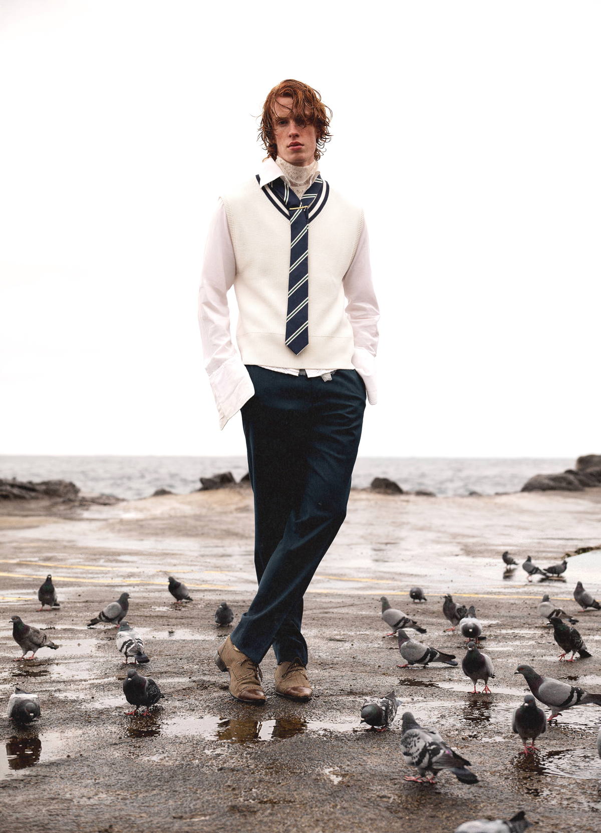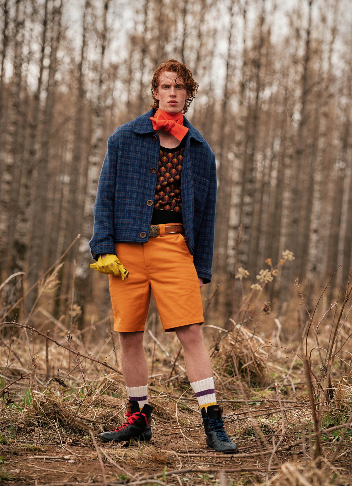 Jacket and Vest by DRIES VAN NOTEN, reflecting a seasonless design philosophy and reduced overproduction. Collar by DIOR, rooted in craftsmanship and evolving traceability practices. Bermuda Shorts by DICKIES, designed for durability and extended wear. Ankle Boots by CAMPER, combining Mediterranean craftsmanship with eco-design initiatives. Wool Socks by EL GANSO, produced in Europe with a growing focus on responsible materials.
