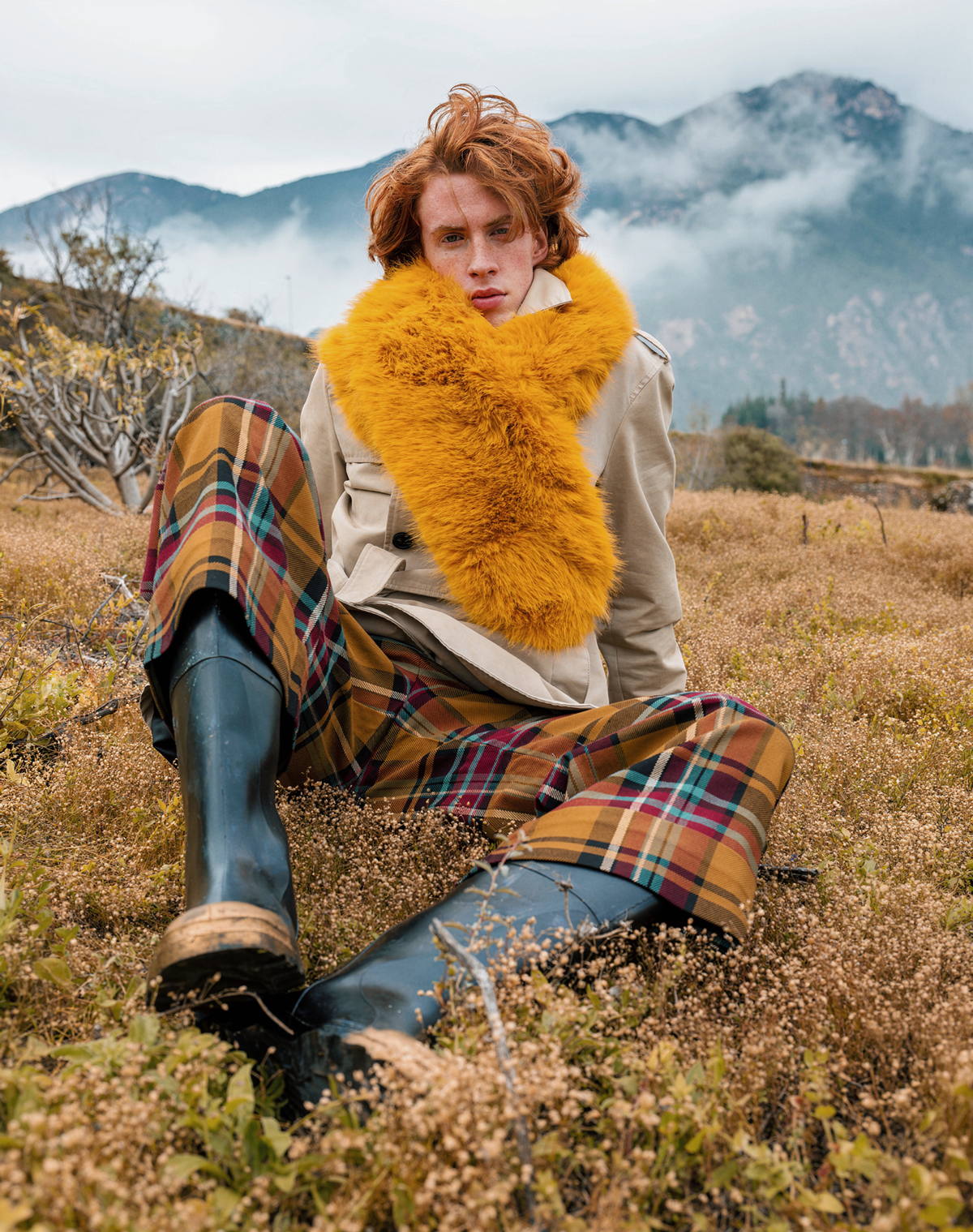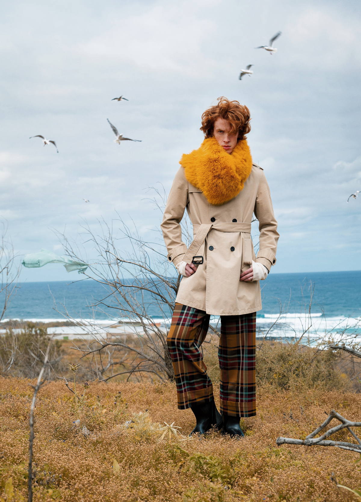 Trench Coat by BURBERRY, committed to carbon reduction and responsible sourcing. Fur Scarf by SAINT LAURENT, advancing traceability and material responsibility. Tartan Trousers by VIVIENNE WESTWOOD, rooted in activism and reduced production volumes. Shoes by PAUL SMITH, focused on craftsmanship and longevity.