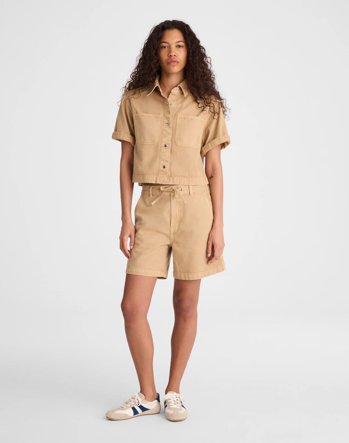 Airy denim cropped loose-fit button-down shirt with drawstring shorts