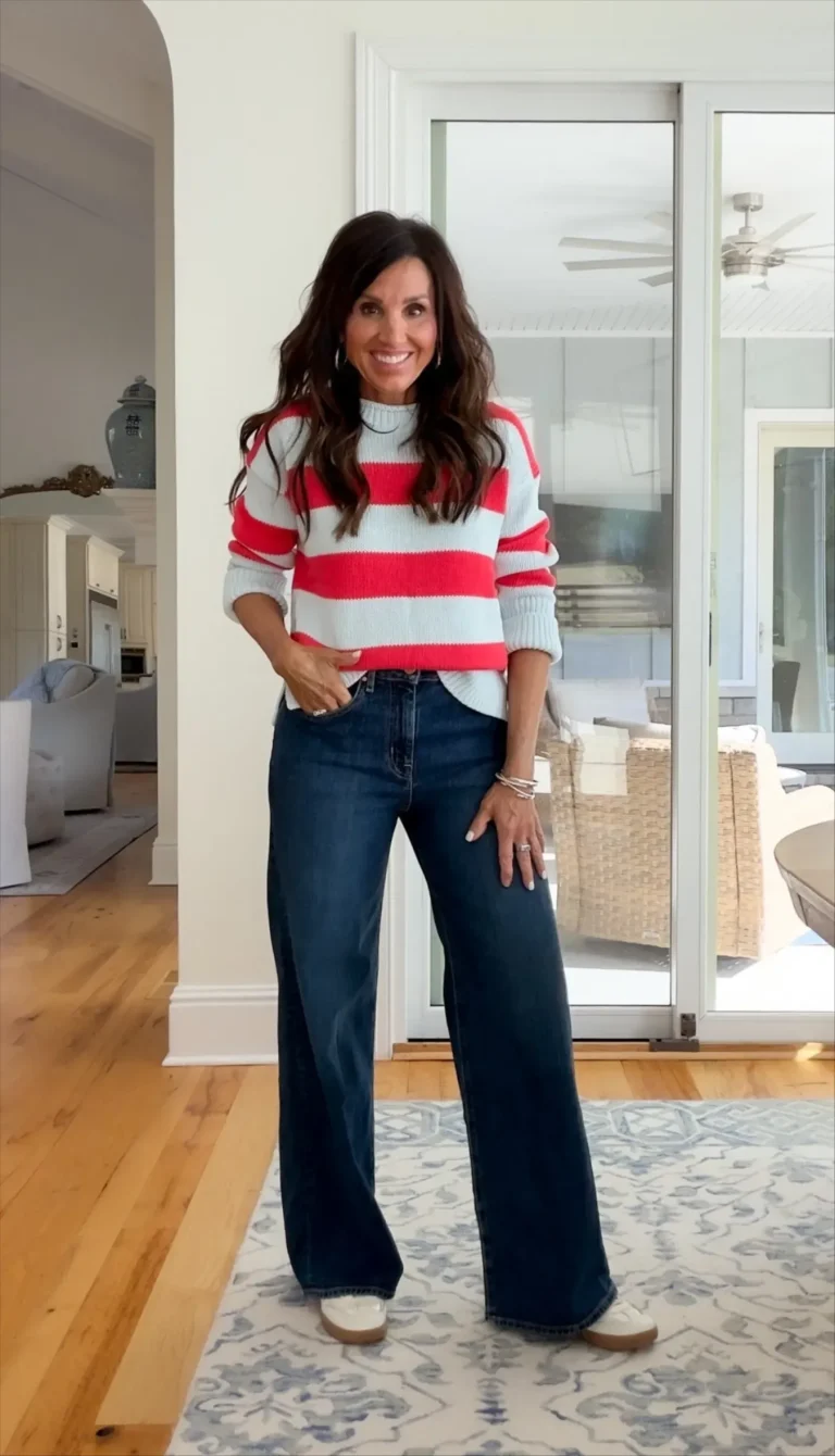 This striped sweater feels like a fresh take on a classic nautical style. The slightly relaxed fit paired with dark wide leg jeans keeps it modern, while the neutral loafers pull everything together in an easy, everyday way.